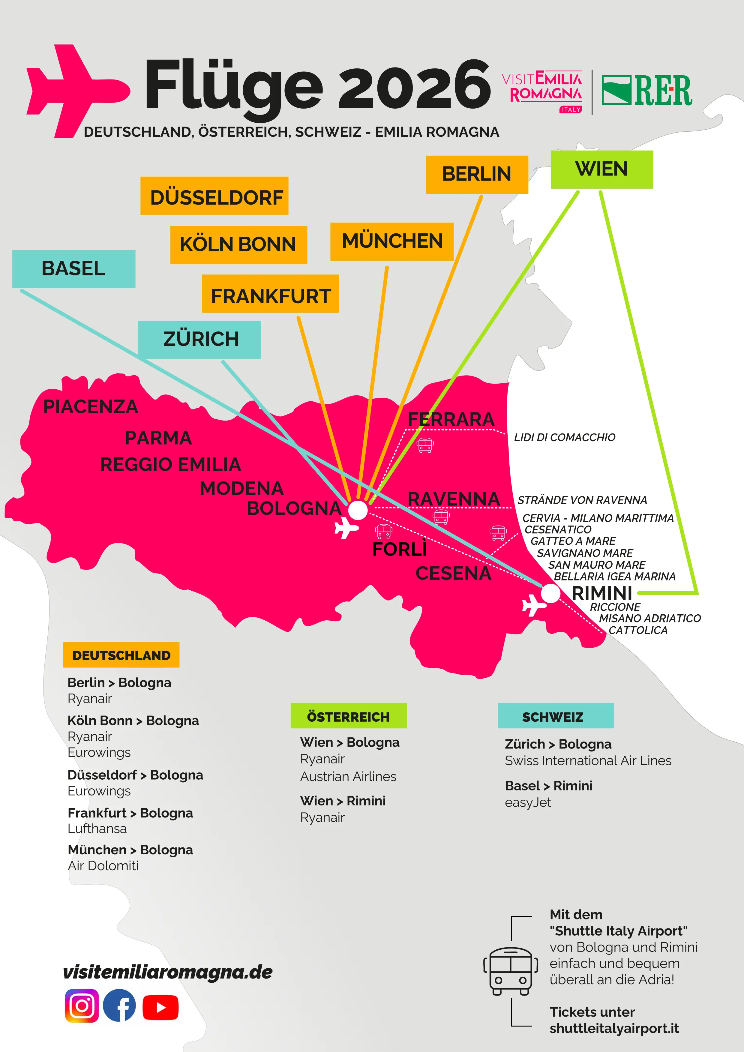 Von den großen deutschen Flughäfen sowie vom Flughafen Wien, Zürich und Basel starten zahlreiche Direktverbindungen in die Emilia Romagna und bringen Urlauber innerhalb kürzester Zeit nach Italien.