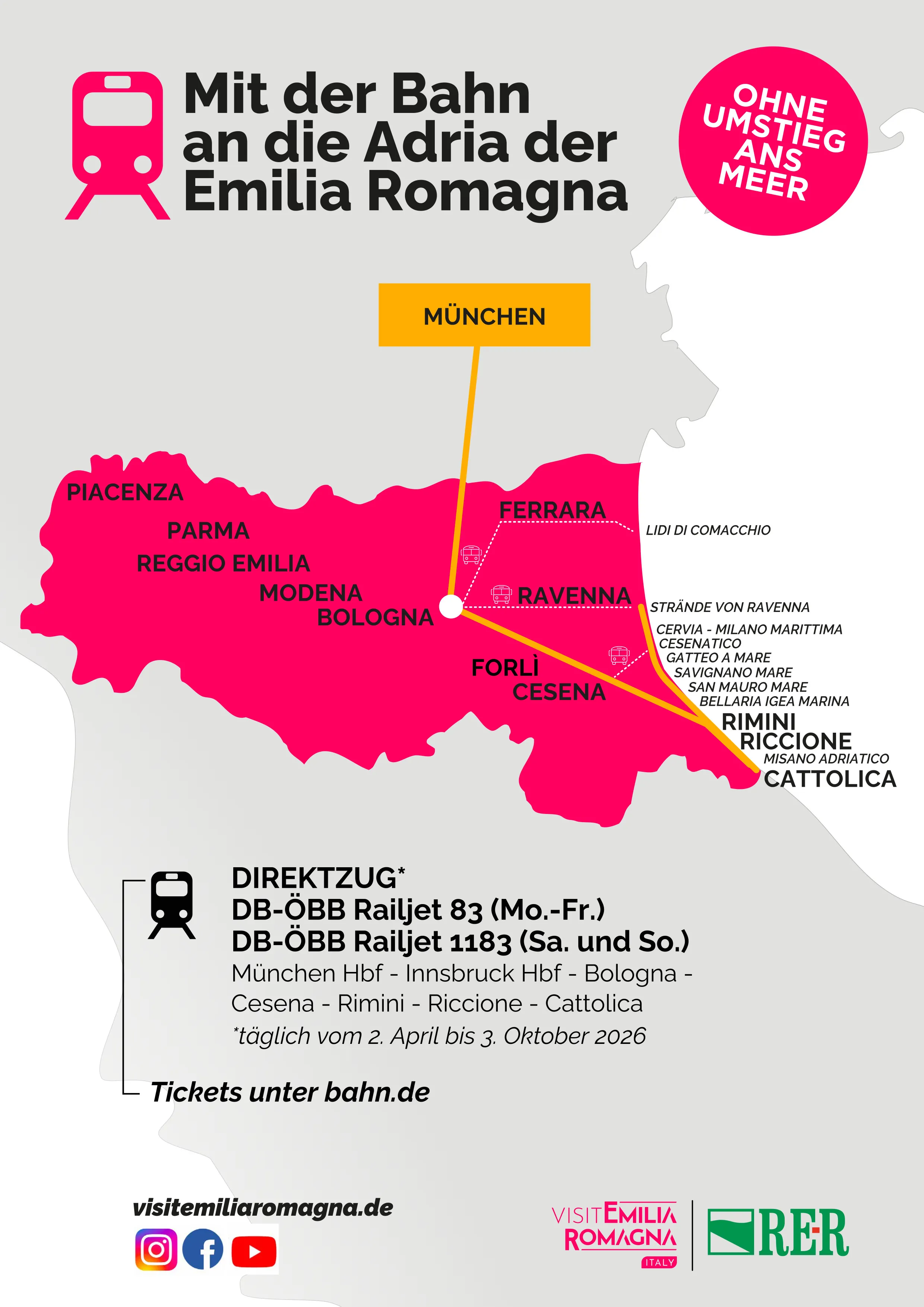 Die neuen Railjet-Züge von DB und ÖBB fahren wieder ab April 2026 täglich von München ans Meer, mit Halt in Bologna, Cesena, Rimini, Riccione und Cattolica, wovon alle Ortschaften an der Adriaküste dank den vielen regionalen Zügen leicht zu erreichen sind. Damit kommen Urlauber nicht nur weiter in den Süden der Emilia Romagna. Auch die Urlaubssaison verlängert sich, weil die Railjets 2025 bereits am 2. April starten mit bis zu 230 Stundenkilometern und ausgeweitetem Bordservice die Adria der Emilia Romagna anfahren.