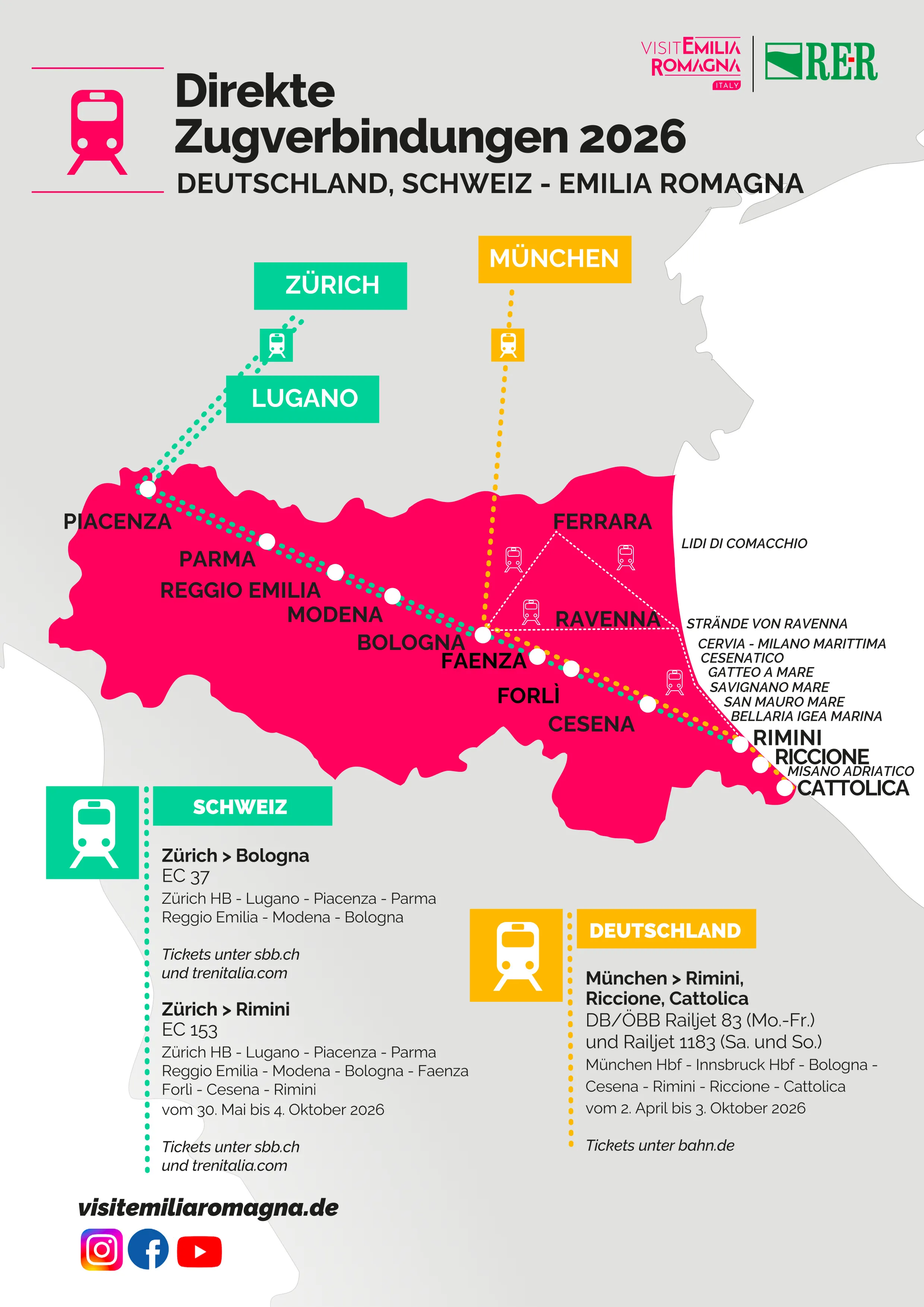 Neben der täglichen Direktverbindung aus der Schweiz von Zürich nach Bologna, gibt es mit SBB und Trenitalia ab dem 30. Mai 2026 auch noch eine zusätzliche, direkte Zugverbindung von Zürich nach Rimini. Halt macht der Eurocity 153 in der Region in Piacenza, Parma, Reggio Emilia, Modena, Bologna, Faenza, Forlì und Cesena. Fahrtzeit beträgt in Summe circa acht Stunden von Start bis Ziel mit einem sehr bequemen Fahrplan: Man fährt am Vormittag in Zürich ab (10:33 Uhr) und kommt am späten Nachmittag in Rimini an (18:23 Uhr).