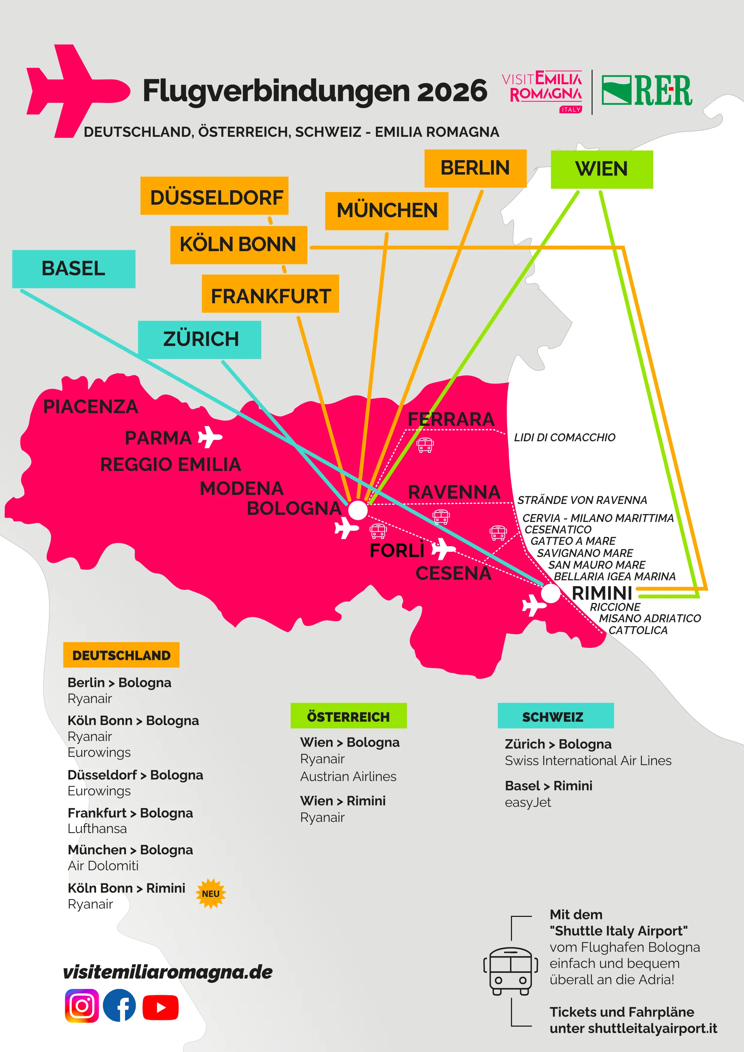 Von den großen deutschen Flughäfen sowie vom Flughafen Wien, Zürich und Basel starten zahlreiche Direktverbindungen in die Emilia Romagna und bringen Urlauber innerhalb kürzester Zeit nach Italien.